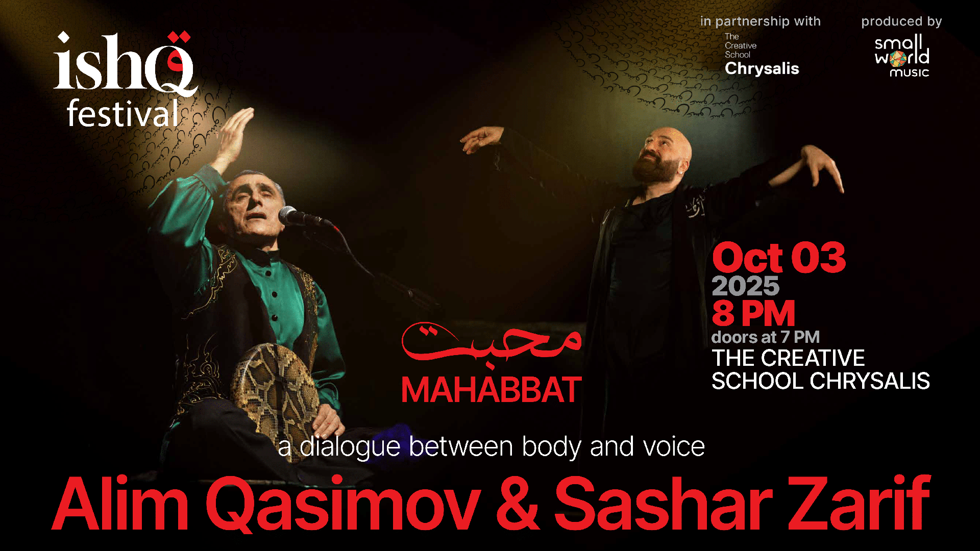 ISHQ Festival presents a rare and transformative experience: Mahabbat (محبّت)—a groundbreaking collaboration between Alim Qasimov, the legendary voice of Azerbaijani Mugham, and Sashar Zarif, internationally acclaimed choreographer and dance innovator.