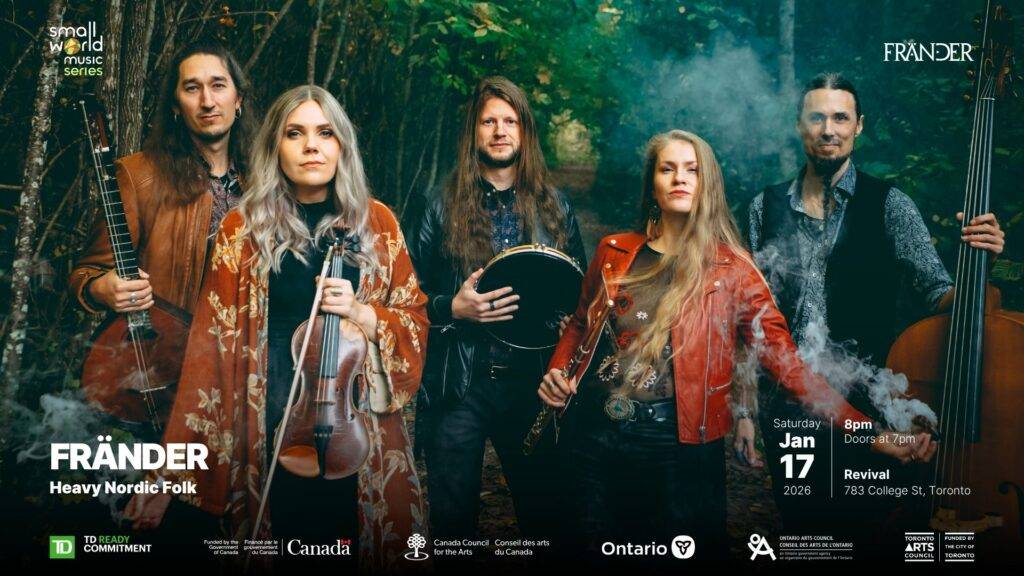 Presented by Small World Music Experience an evening of neo-traditional folk music with classical precision and head-banging grooves. FRÄNDER blends Swedish and Estonian folk traditions with a modern twist, creating a contemporary “heavy folk” sound. The result is a driving and robust sound, ready for the great stages. FRÄNDER conjures an expressive musical landscape, evocative […]