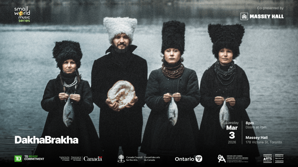 Presented by Small World Music and Massey Hall Direct from Kyiv, DakhaBrakha returns with their self-described “ethno chaos” of folk-pop-rap-punk music. Reflecting fundamental elements of sound and soul, DakhaBrakha creates a world of unexpected new music. Using Ukrainian polyphony as its foundation, they interweave complex rhythmic and melodic structures from India, Arabia, Africa, and […]